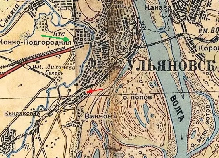 Красной стрелкой указано место нахождения первого Ульяновского автозавода, преобразованного в УЗМД, зеленой – место строительной площадки второго Ульяновского автозавода