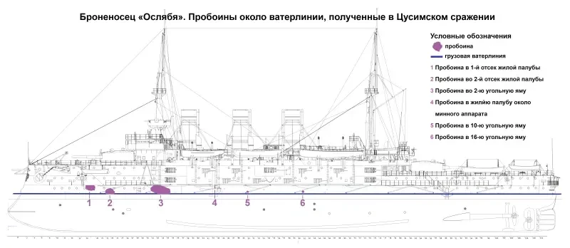 Японские 8…12-дм снаряды при попадании в бронепояс неоднократно нарушали герметичность борта и вызывали затопление находившегося за бронёй бортового коридора. В районе же надводного минного аппарата «Осляби» бортового коридора не было. Находившиеся на жилой палубе люди сразу же обнаружили и заделали пробоину.