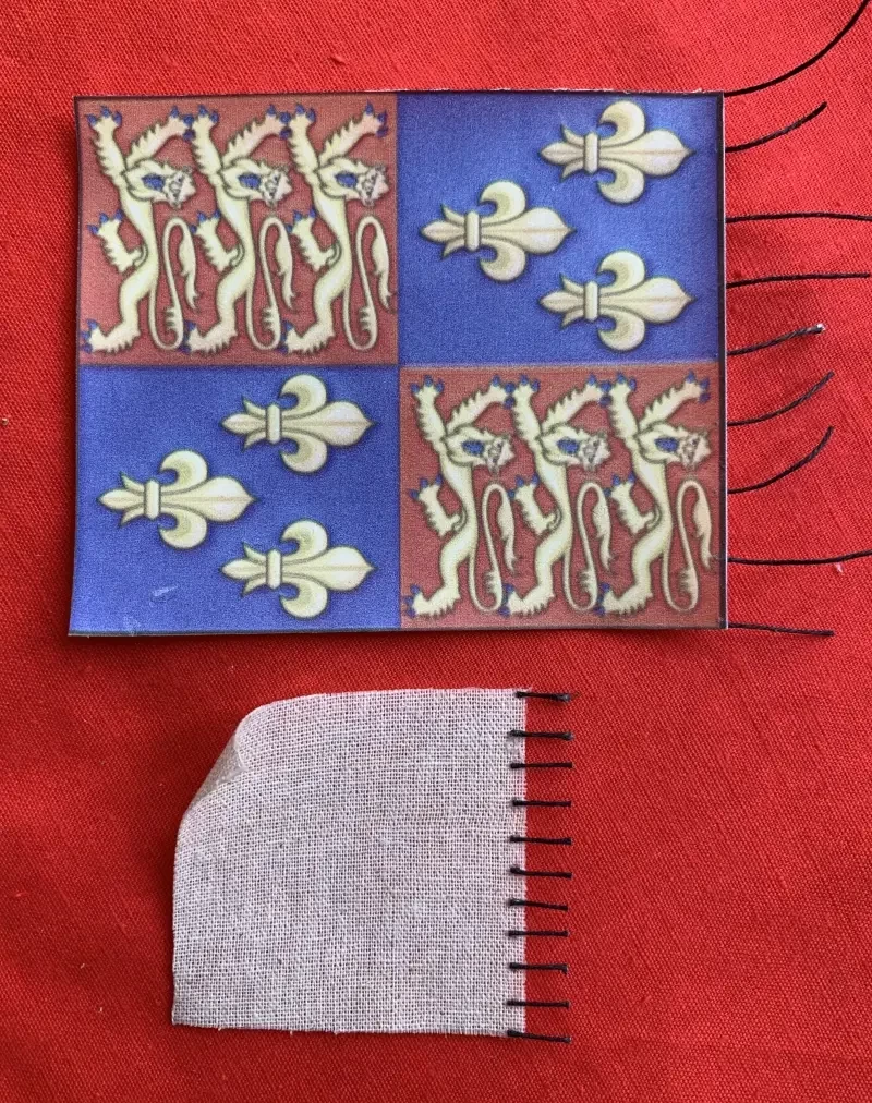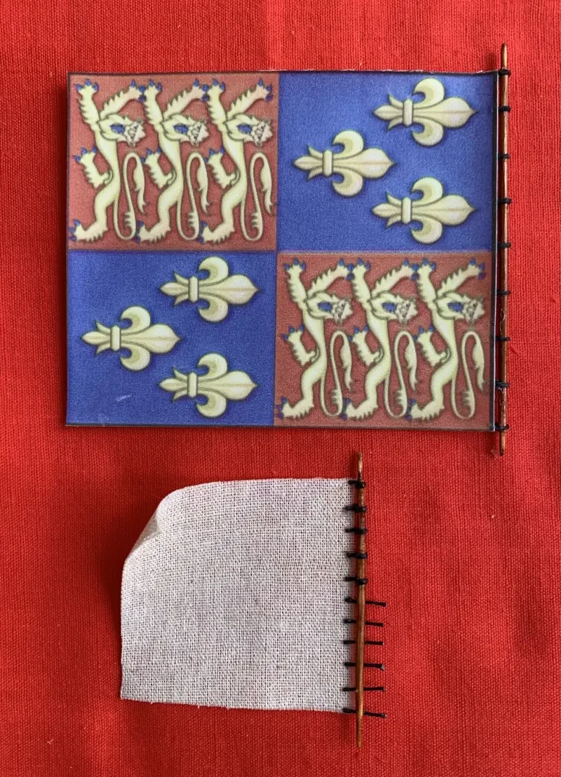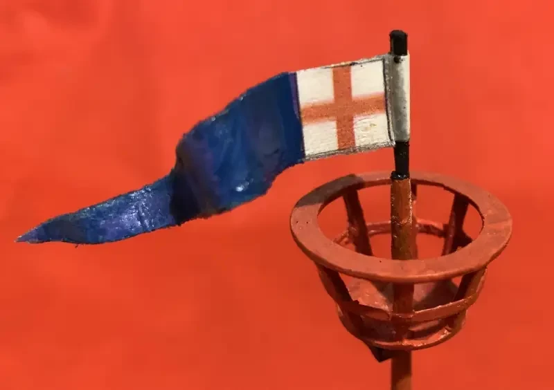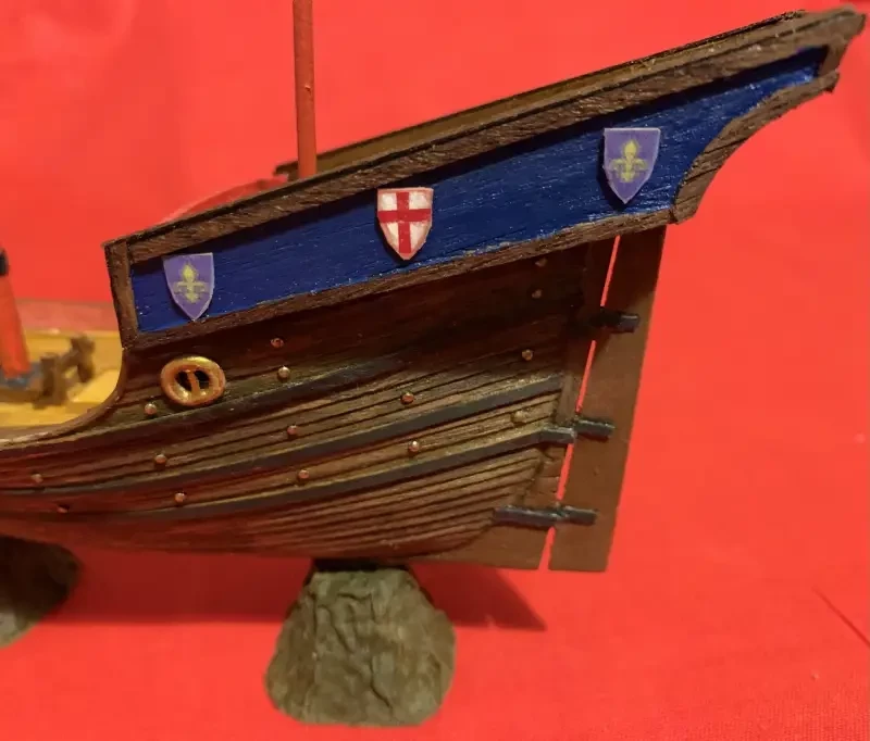 Щитов по бортам с крестами Св. Георга и французскими королевскими лилиями установлено ровно столько, сколько их изображено на печати. Вымпелы из ткани, а изображения на них – это термодекали из местной типографии, и переведены на них давлением горячего утюга. Потом ткань была пропитана суперклеем, а сами вымпелы высушены так, как если бы их трепал морской бриз.
