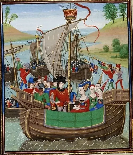 «Хроники Фруассара». Королева Изабелла возвращается в Англию вместе с лордом Мортимером. Борт судна задрапирован полотнищем из ткани