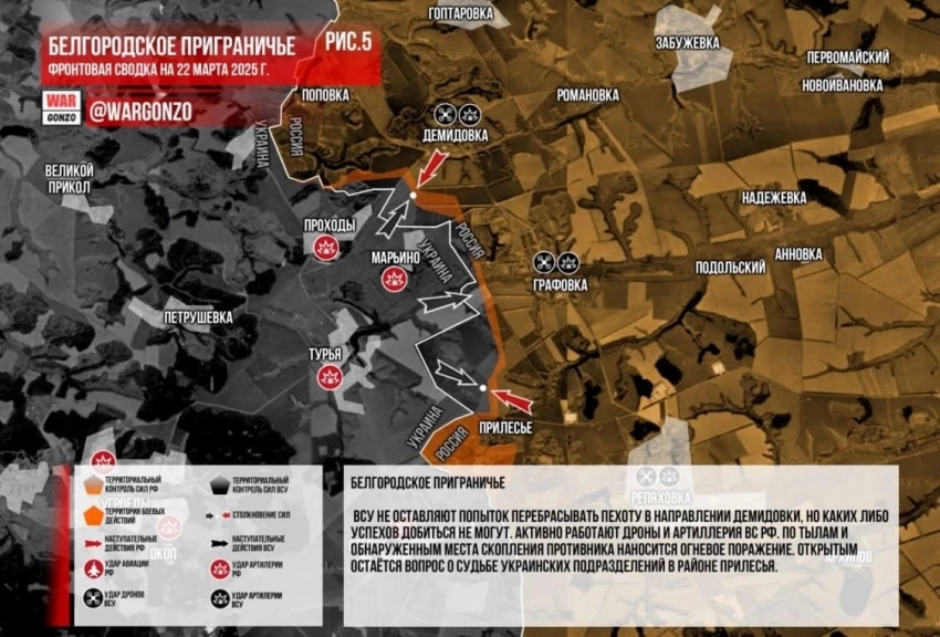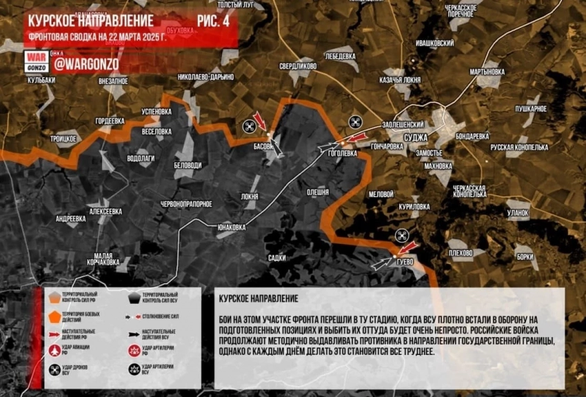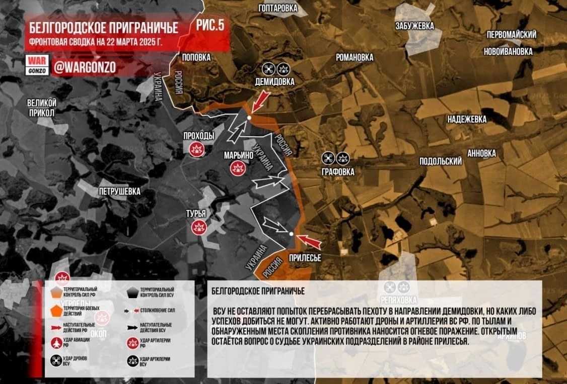 В приграничных районах Курской и Белгородской области идут ожесточённые бои: свежая карта боевых действий от 22 марта