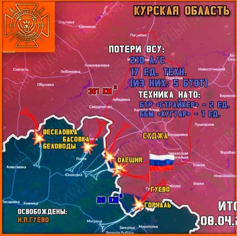 В Курской области ВСУ сейчас контролируют только Горналь и Олешню. Минобороны сегодня официально объявило об освобождении Гуево, за которое шло ожесточённое сражение более десяти дней.