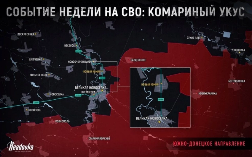 Самые ожесточенные бои сейчас идут за Новый Комар - ВСУ предпринимают попытки контратаковать и вновь вытеснить русскую армию. Цель сражения, конечно, не сама полупустая деревня, а дорога, ведущая на север, через нее происходит снабжение украинских войск в Великой Новоселки. Само поселение пока под контролем противника, но делу время. С его захватом ВС РФ откроют себе дорогу для уничтожения всей линии укреплений, тянущейся на запад, и тем самым создадут проблемы ВСУ на застывшем фронте Запорожья, сообщает Telegram-канал Readovka.