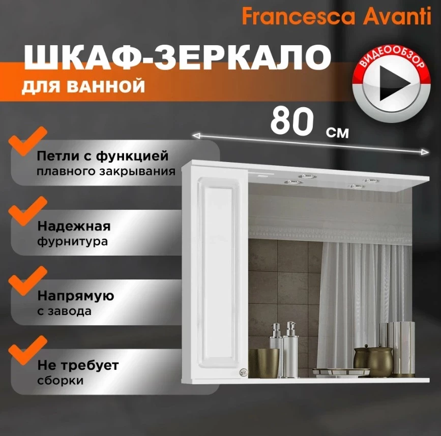 Зеркало-шкаф Francesca Avanti Империя 80 — пример того, как изящная классика может быть на 100% функциональной. Белый глянцевый фасад с фрезеровкой, бронзовой ручкой и встроенной подсветкой моментально преображает интерьер. Продуманная внутренняя организация с двумя полками и удобной открытой нишей делает хранение косметики и гигиенических средств максимально удобным. Петли с доводчиками, розетка и выключатель встроены в карниз — всё для вашего комфорта и без лишних усилий при монтаже, ведь изделие поставляется уже в сборе.