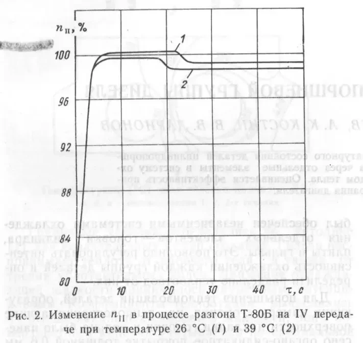 В процессе испытаний измерялась частота вращения второго каскада турбокомпрессора n2 в процессе разгона танка Т-80Б на IV передаче. При полном разгоне турбокомпрессора второго каскада, через 6-7 секунд от начала разгона танка, в течение 15 секунд (tₐ = 39 °C) или (tₐ = 26 °C) регулятор температуры устанавливал повышенный расход топлива по сравнению с расчётным для данной tₐ. После нагревания деталей двигателя регулятор снижал расход до расчётной величины (рис. 2). Таким образом, тепловая инерция обеспечила большую мощность двигателя и позволила повысить интенсивность разгона. Учитывая, что продолжительность разгона на II и III передачах составляет 12...14 и 21...25 секунд, то он проходит при повышенной мощности двигателя.