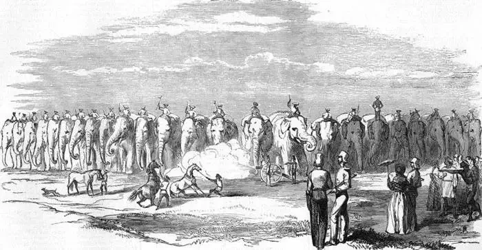 Здесь стоит сделать лирическое отступление и немного коснуться использования слонов на войне. Времена, когда слоны были своего рода танками, к XIX веку уверенно завершились. Тем не менее, в Юго-Восточной Азии их активно использовали в качестве вьючных животных, причём как перевозящих орудия и боеприпасы, так и подвижных артиллерийских платформ. Правда, у слонов в этом качестве было несколько неискоренимых недостатков.