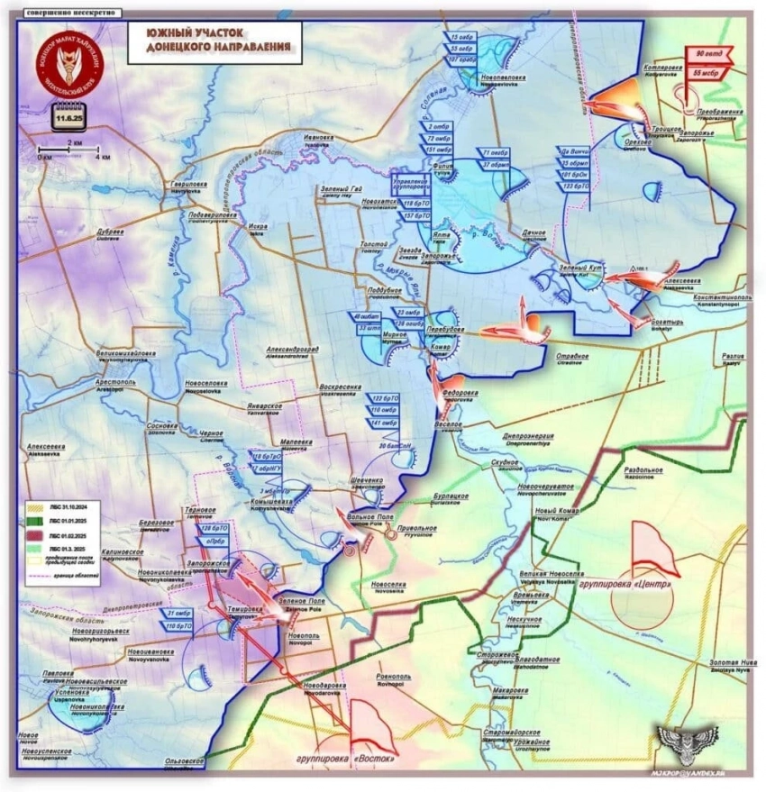 На Угледарском направлении Вооружённые силы Российской Федерации (ВС РФ) закрепились в Зелёном Поле, давят к Запорожскому и Темировке, вышибли противника восточнее Комара. Минобороны подтвердило взятие Зелёного Кута - село между Богатырём и границей с Днепропетровщиной. На Орехово-Новоукраинка-Андреевка угроза оперативного окружения ВСУ.