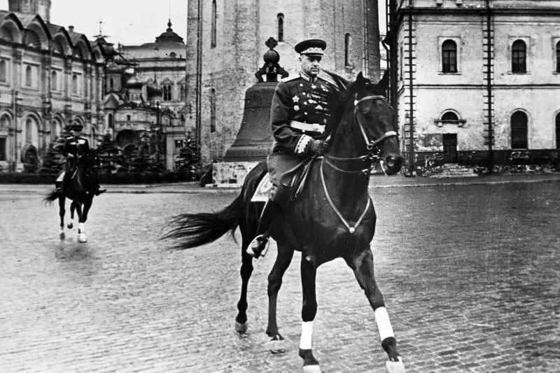 Маршал Советского Союза Георгий Константинович Жуков принимает Парад Победы в Москве. Под ним конь терской породы светло-серой масти по кличке Кумир.