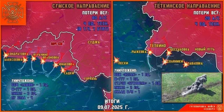 На Сумском направлении противник контратакует с переменным результатом. Главным критерием является количество ликвидированного личного состава и уничтоженной техники противника. ВКС России перемалывает наступающие порядки ВСУ тяжелыми ФАБами, вскоре контрнаступательный порыв врага сойдет на нет. Тем не менее, ресурсы ГрВ «Север» пишут, что наши смогли за сутки продвинуться у Юнаковки и Варачино.