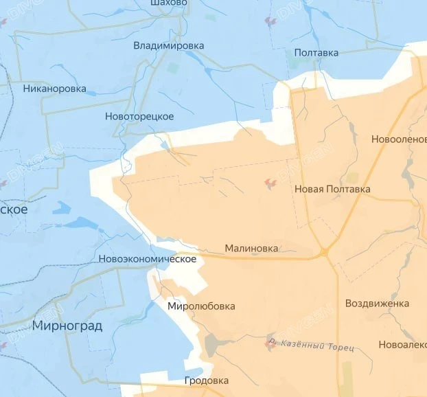 ВС РФ продвигаются на рубеже Новоторецкое - Разино, штурмуют Фёдоровку, вышли к окраинам Бойковки и развивают наступление в сторону шахты Краснодиманская, Родинского и Доброполья. Удары БпЛА уже наносятся по объектам в Родинском и достигают окраин Доброполья.