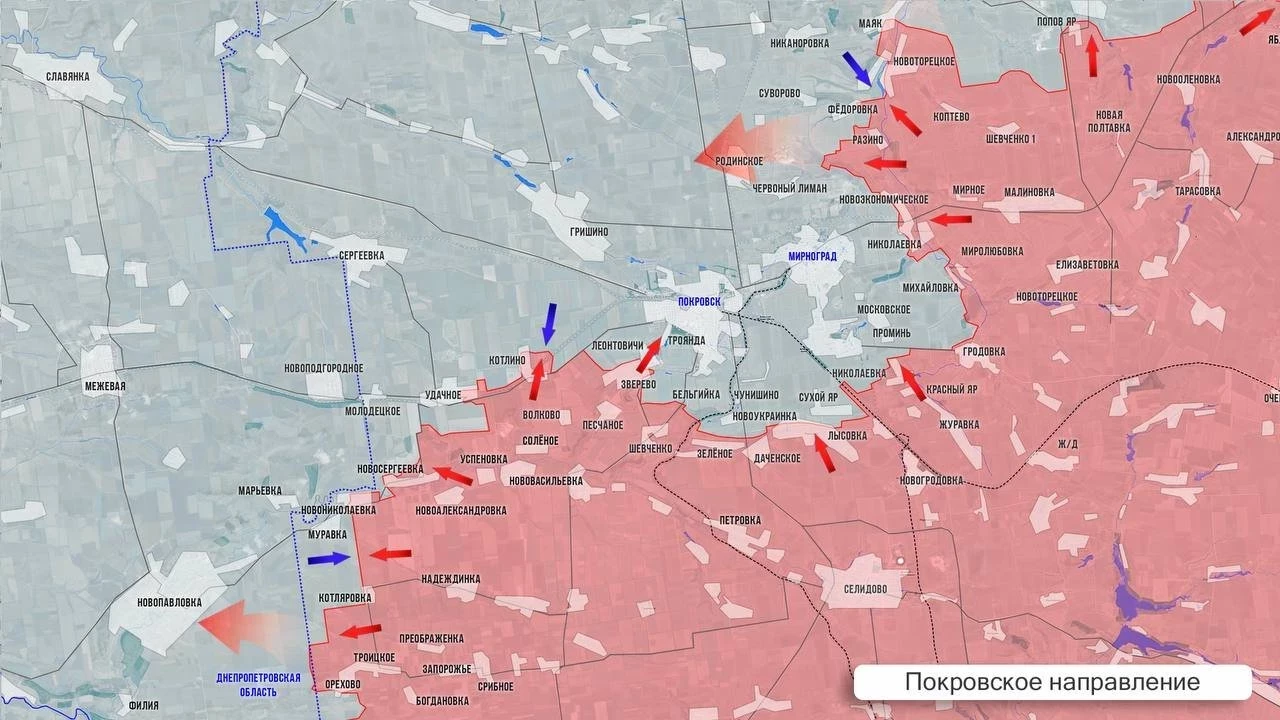 На Покровском фронте ситуация очень подвижна. На западном фланге ожесточённые бои в районе Котлино. В Леонтовичах ВС РФ стараются потеснить противника, чтобы выйти на ближайшие рубежи для штурма Покровска. Упорные бои в районе Новоукраинки. Восточнее, со стороны Николаевки ВС РФ продвигаются в сторону Сухого Яра. Со стороны Гродовки ВС РФ приближаются к сёлам Проминь и Московское. Севернее Мирнограда бои идут в районе Красного Лимана, где штурмовики стараются выбить противника с территории шахты. Лётчики ФАБ-1500 уничтожили крупный ПВД ВСУ в Родинском. Выше по фронту наши войска теснят противника в районе Суворово, Никаноровки и Нового Шахово.