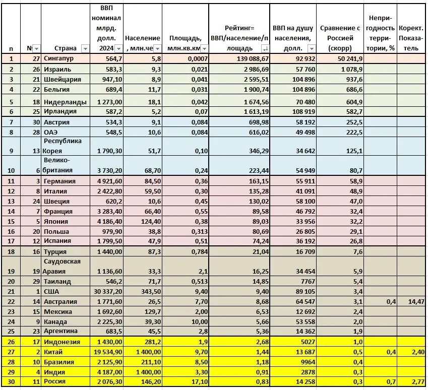 Попробуем сделать расчеты по предложенной модели, взяв за основу страны из ТОП-30 мирового ВВП. Результаты по показателю эффективности — ВВП/население/площадь — оказываются крайне интересными.