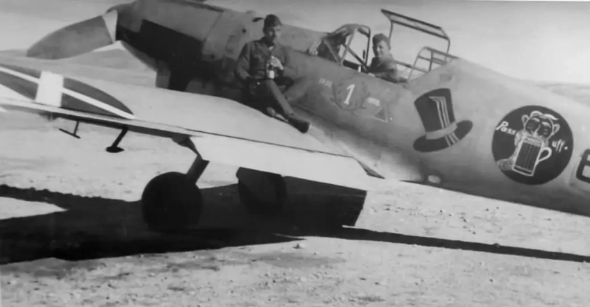 Тот самый Bf 109 B-1 6-10, пилот Гюнтер Лютцов. Цифра «1» и лавровый венок — обозначение числа сбитых. Черный цилиндр был эмблемой второй эскадрильи. В черном круге, отличительном знаке националистов, изображен пилот, пьющий пиво. Снимок был сделан седьмого апреля 1937 года, на следующий день после первой победы. Окончательное число сбитых Лютцовым в Испании самолётов — пять.
