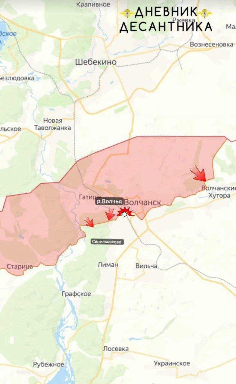 На Харьковском направлении ВС РФ продвинулись на 200 м. в лесу западнее Синельниково, уничтожив позиции ВСУ. В Волчанске сорвали контратаку ВСУ на левом берегу р. Волчья, нанеся огневое поражение. На востоке города есть продвижение у н.п. Тихого. Авиация атаковала позиции ВСУ на левобережье. Бои на левом берегу реки Волчья продолжаются. Взаимные атаки и встречные бои идут вдоль коттеджного поселка на левом берегу Травянского водохранилища.