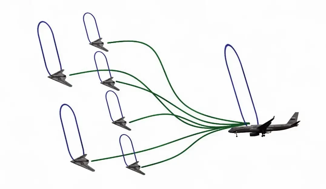 При этом машины, находящиеся в максимальной близости к атакуемому БПЛА, осуществляют постановку радиоэлектронных помех «со стороны». По открытым данным, именно такая тактика является наиболее эффективной для срыва захвата цели атакующими ракетами «воздух-воздух» или ЗУР противника, когда помехи ставятся не самим атакуемым самолётом, а другими машинами группы.