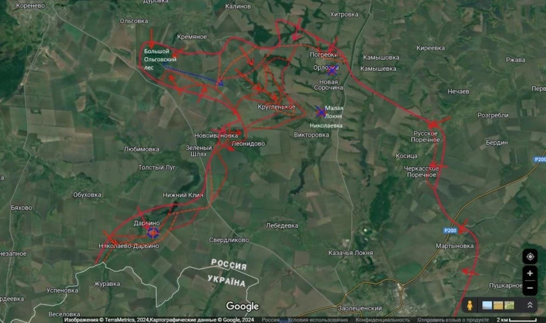 Штурмовые отряды российской армии атакуют по балке по направлению на село Николаевка, которая далее переходит к селу Малая Локня.