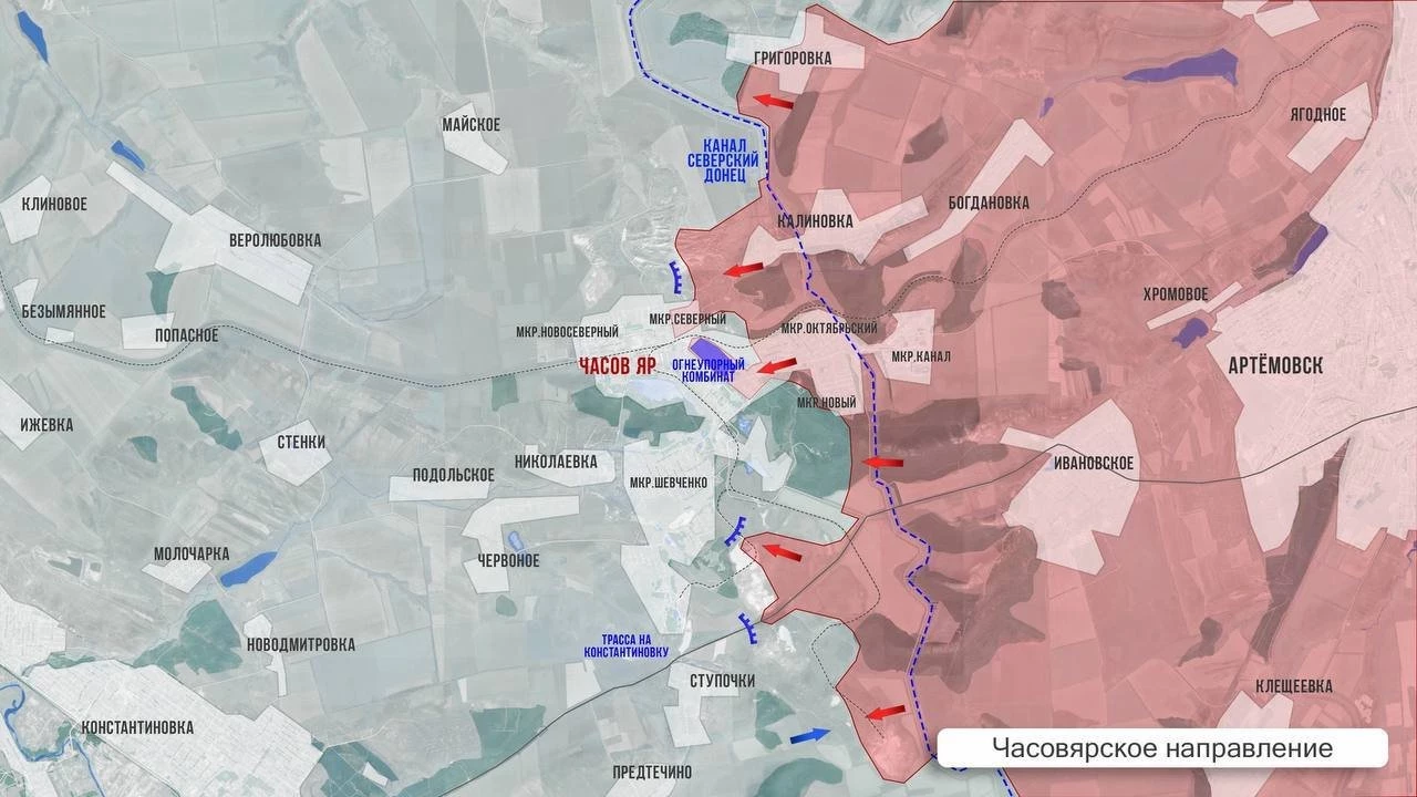 В Часов Яре основные бои по-прежнему идут за завод огнеупоров. Наши части давят на многоэтажки в центре и со стороны мкр. Октябрьский, и со стороны мкр. Северный. На этом участке тоже активна наша авиация.