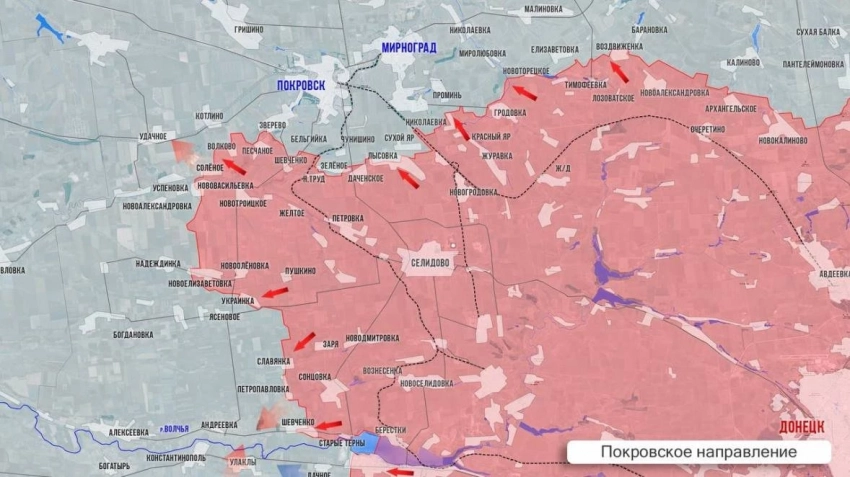 На Покровском направлении ВС РФ формирует правый фланг для охвата Покровской агломерации. Наши продвигаются к Зеленому Полю и Барановке. Отбивая контратаки ВСУ, наши продвинулись на 3 км в районе Воздвиженки к развязке трассы Покровск-Константиновка и вышли на западные окраины Водяного Второго. Западнее, с плацдарма за р.Казённый Торец ВС РФ прорвались к южным подступам Елизаветовки. Таким образом российские силы продвигаются на Мирноград. Идут бои в районе Миролюбовки и Проминя. Удалось потеснить противника в районе Сухого Яра и Лысовки. Наши бойцы с трех сторон давят на Зелёное, закрепились в его западной части, штурмуют Зверево. Помимо этого наши расширяют зону контроля перед линией обороны противника на участке Котлино-Удачное. Установлен огневой контроль над трассой, ведущей от Покровска к Удачному и далее - на Запорожье и Днепропетровск. Идут ожесточённые сражения в районе Успеновки - Нововасильевки. Наши штурмовики продвигаются к Новоалександровке и в районе Срибное-Новоандреевка, а также к Ясеневому со стороны Украинки. Южнее наши войска прорывались на рубеже Славянка-Петропавловка в направлении Андреевки. За Славянку бои продолжаются, а вот Петропавловка была освобождена, и начались бои за опорный пункт южнее. Ночью наши бойцы выровняли фронт в районе Петропавловка-Шевченко (не того, где месторождение лития). ВСУ отошли на рубежи Константинополь-Андреевка-Богатырь.