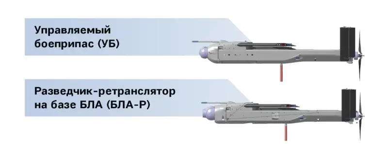 Второй БПЛА обозначен как УБ (управляемый боеприпас). По сути, это барражирующий боеприпас с собственной оптикой и боевой частью. Сообщается, что штатная БЧ имеет несколько эффектов. Масса изделия не уточняется.
