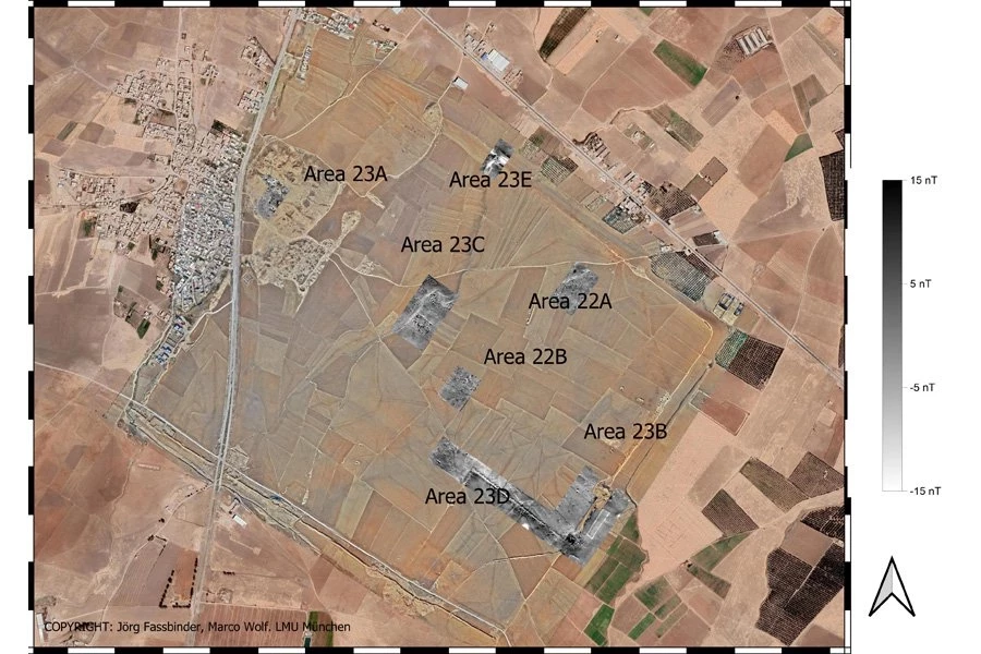 Команда Фассбиндера провела свою операцию дистанционного зондирования в 2022 году. Вместо того, чтобы установить магнитометр на транспортном средстве или беспилотнике, что могло бы привлечь нежелательное внимание, Фассбиндер и его коллега-исследователь вручную переносили 15-килограммовое устройство туда и обратно над захороненной столицей. Они работали в течение семи дней, охватив 0,3 квадратных километра — что все еще составляет менее 10% территории.