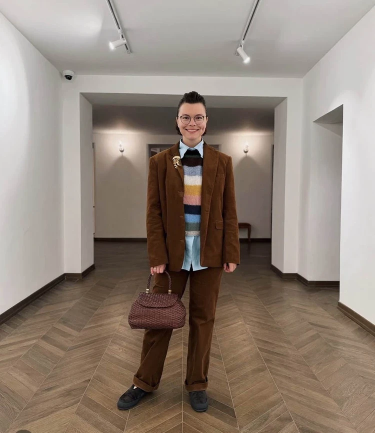 Татьяна собрала стильный ретро-лук, в котором сочетала сразу несколько трендов. Ультрамодный вельветовый костюм коричневого цвета молодая супруга Петросяна скомбинировала с голубой рубашкой и полосатым джемпером в бабушкином (или дедушкином) стиле. Кстати, «дедушкин стиль» популярен у зарубежных инфлюенсеров. Дополнила ансамбль плетеной сумкой (плетеные изделия вот-вот войдут в моду) и замшевыми лоферами. На этот раз обошлось без головных уборов, на зато появилась оригинальная брошь.
