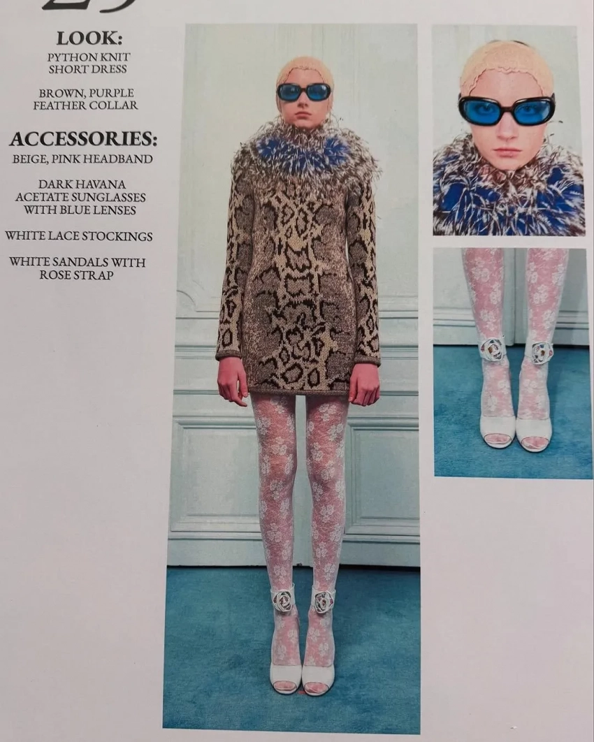 Кай Шрайбер прошёлся по подиуму в меховом леопардовом платье, белых ажурных колготках и босоножках на каблуках. Образ дополнили солнцезащитные очки в ретростиле и кружевная повязка на голове.