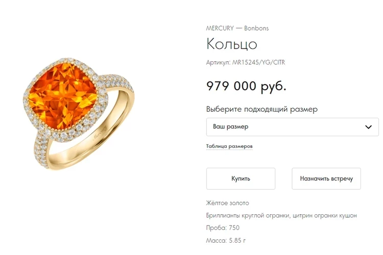 Оказалось, что ювелирное украшение из желтого золота, украшенного бриллиантами круглой огранки и цитрином, обошлось парню в 979 тысяч рублей.