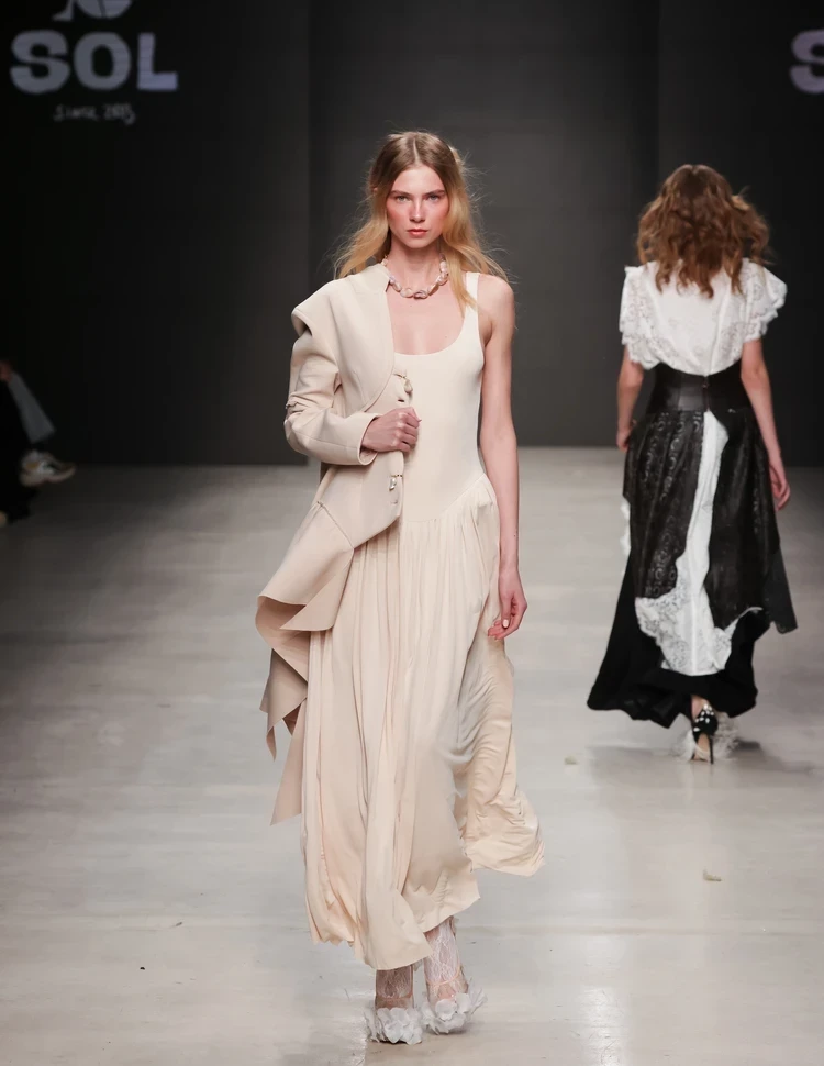 Интересная и воздушная коллекция получилась у основательницы бренда SOL Ольги Селивановой (Москва). Главным материалом Fleur épanouie («Распустившийся цветок») стало кружево, которое украсило платья, юбки и даже обувь. Впрочем, присутствовали образы и с акцентными корсетами, юбками из денима и тренчами из лаковой кожи