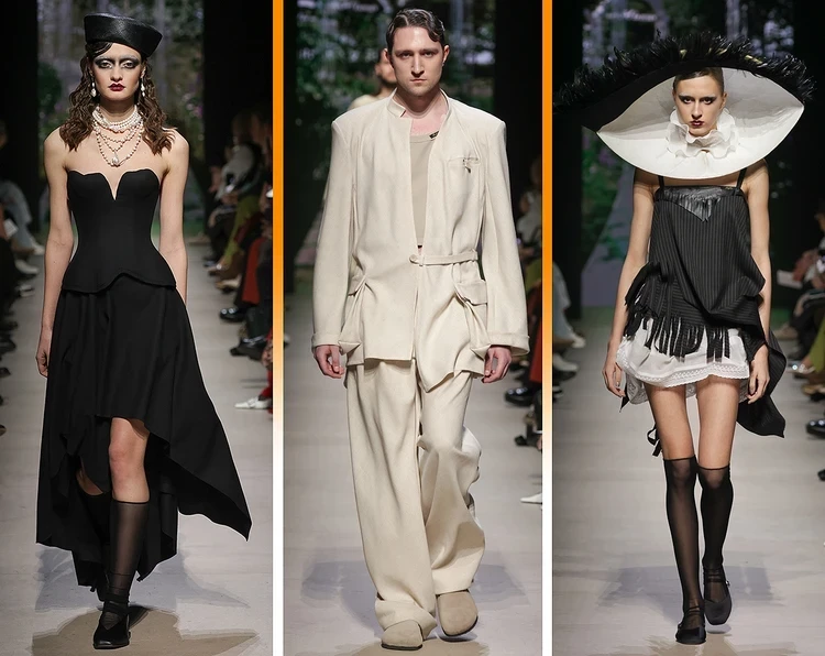 Сюзанна Барс (Maison Suzanna Bars, Москва) вдохновилась декадансом и погрузила зрителей в загадочную Викторианскую эпоху, и мы бы даже сказали — в настоящее готическое кино! Зрители перенеслись во времени и посмотрели, как дамы в старинных платьях и головных уборах Викторианской эпохи прогуливались по темным улочкам. А нам это шоу чем-то даже напомнило нашумевший показ итальянского бренда Schiaparelli в Диснейленде.