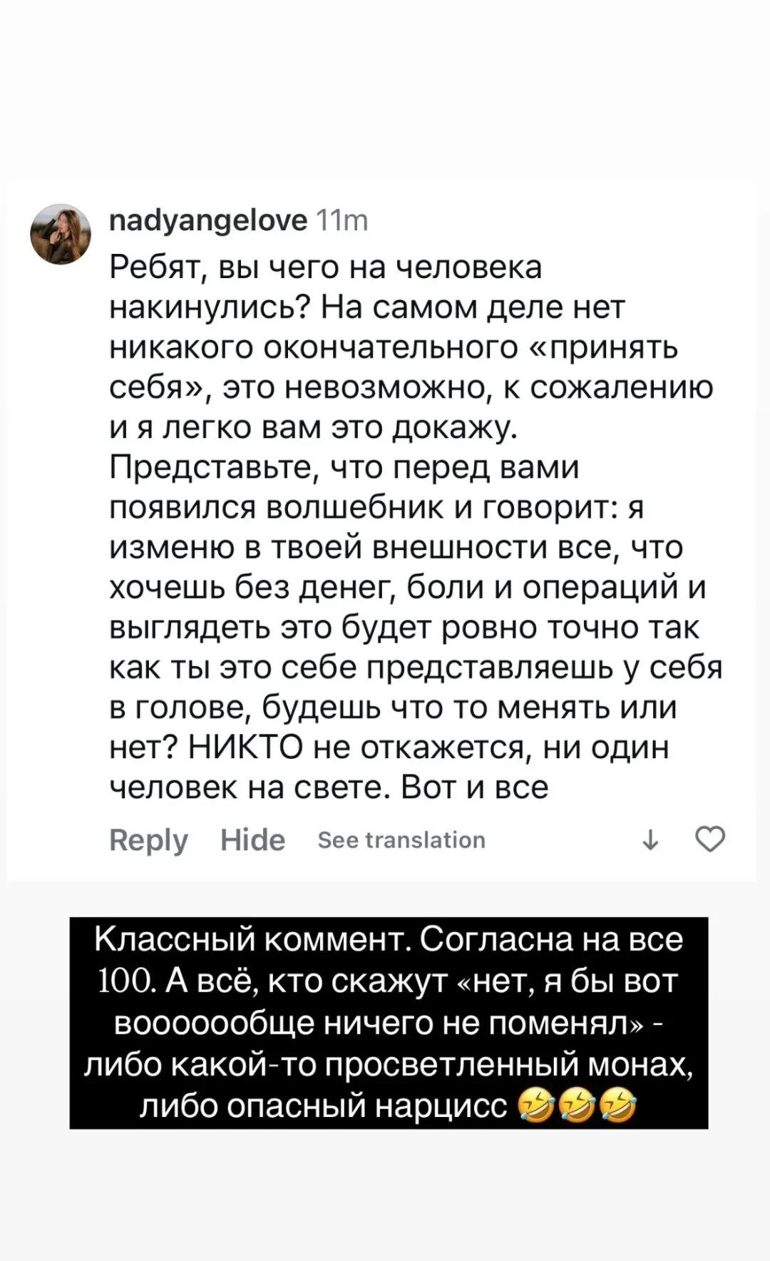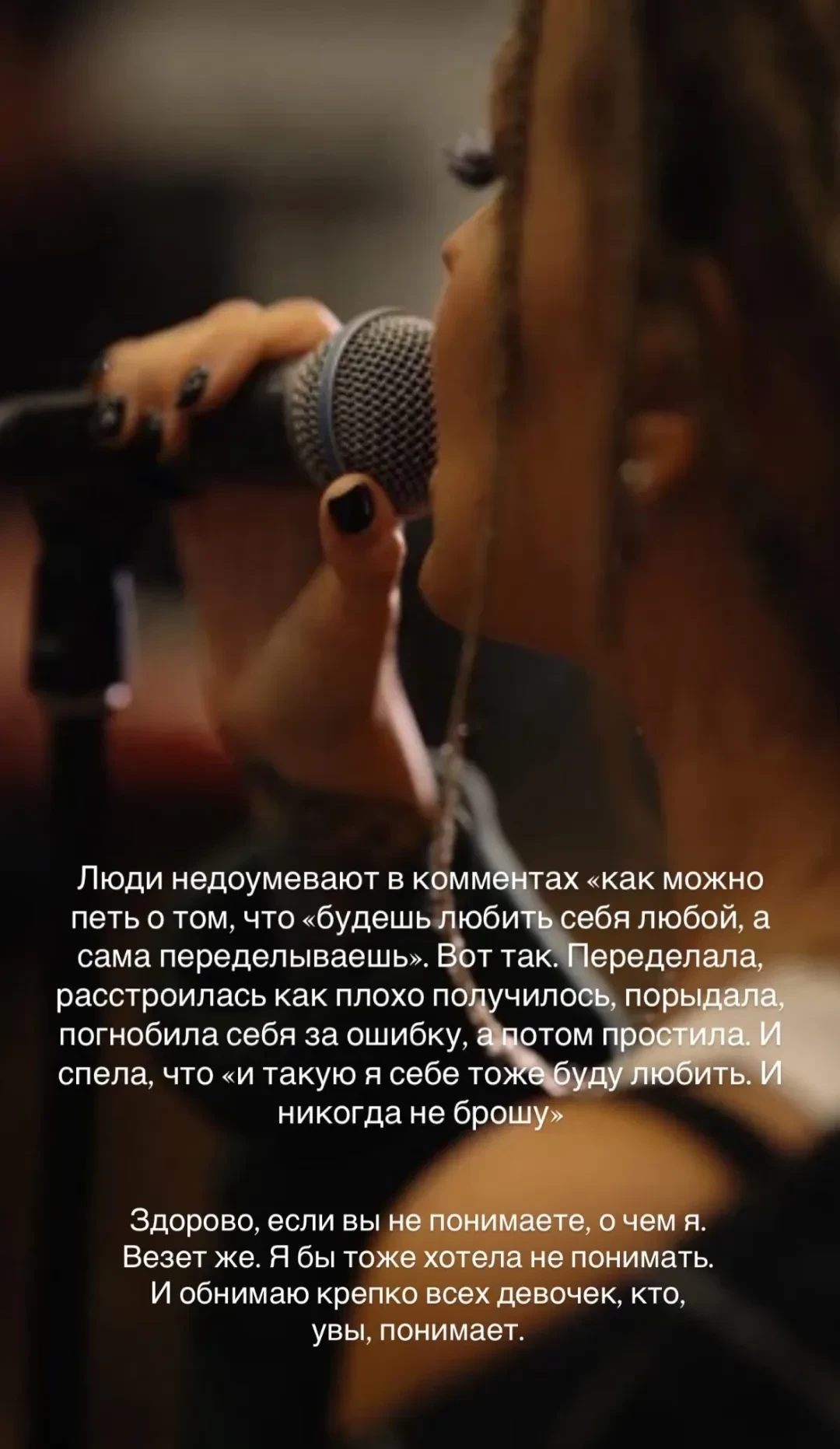 Скриншот из инстаграма* Риты ДакотыПри этом она заявила, что не собирается из-за новой внешности уходить в тень: "Что же мне делать теперь? Уйти навсегда из соцсетей и со сцены? Закрыться от мира? Не выкладывать больше сниппетов? Или слушать от жестоких баб кучу оскорблений в комментах теперь всю жизнь?". Рита не стала скрывать, что плакала из-за "чужого" лица в отражении, но в итоге решила, что будет любить себя любой, даже "такой вот стрёмной, отёкшей и некрасивой, с уродскими глазами и даже без глаз".