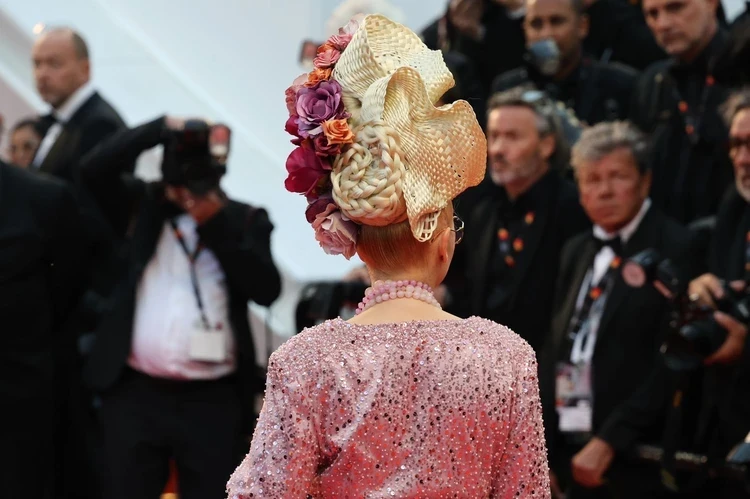 Писательница пришла на премьеру фильма «Новая волна» в нежно-розовом вечернем наряде, расшитом стразами. Ее прическа стала настоящим произведением искусства: голову Лениной украсила целая россыпь розовых, лиловых и красных цветов.