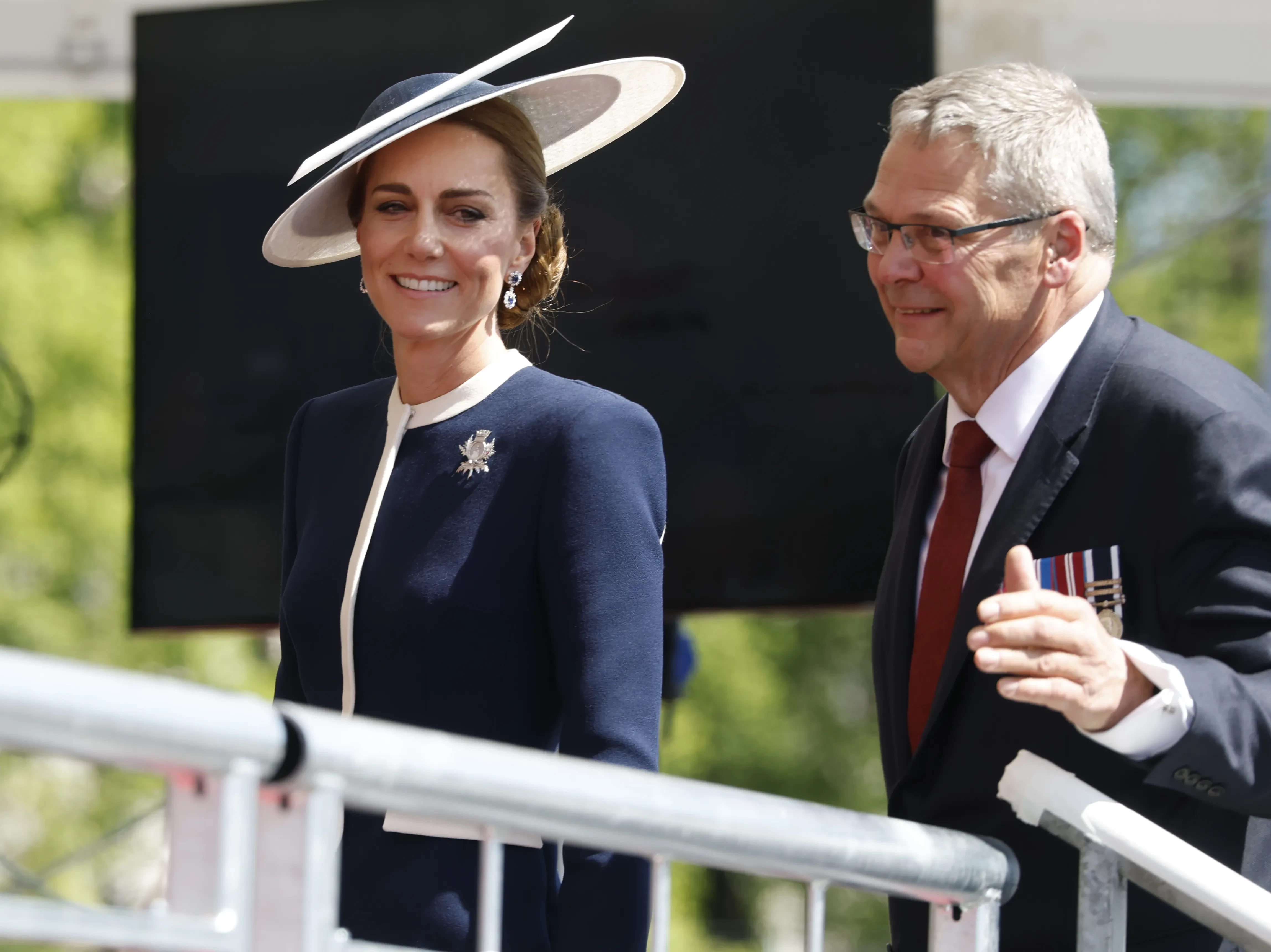 Для официального мероприятия принцесса Уэльская выбрала "морской" образ: синее платье бренда Suzannah London и шляпку Philip Treacy, которую ранее уже надевала на парад в честь платинового юбилея королевы Елизаветы II в июне 2022 года. Наряд дополняли бежевые лодочки Gianvito Rossi, брошь в виде чертополоха и серьги с сапфирами — свадебный подарок от принцессы Дианы. Принц Уильям, как и всегда, появился в классическом костюме.