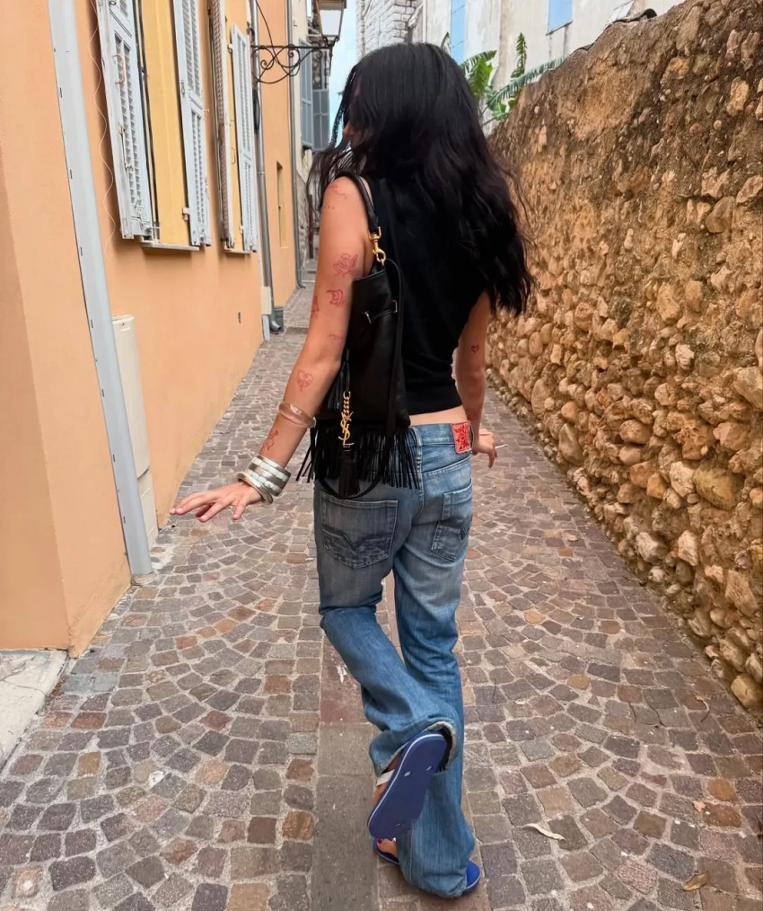 По Ницце Эрика гуляет в платье в горошек, джинсах и вьетнамках, дополнив образы сумкой Yves Saint Laurent.