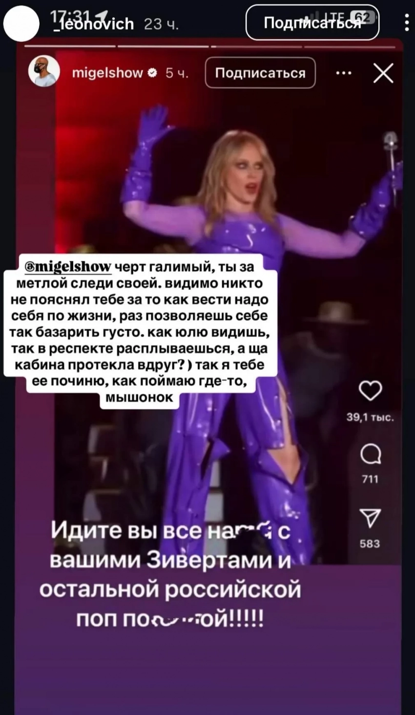Недавно Мигель опубликовал в своём инстаграме* фрагмент выступления 57-летней Кайли Миноуг и сравнил её профессиональный уровень с российскими звёздами, не в пользу последних. "Идите вы все ***** (к чёрту. — Прим. ред.) с вашими Зивертами и остальной российской поп ******** (ерундой. — Прим. ред.)", — написал Мигель.