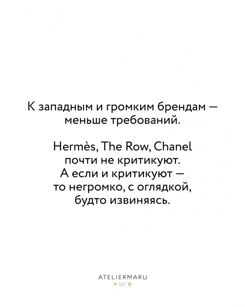 "Иногда кажется, что российский бренд должен не просто шить, а сдать ЕГЭ, пройти полиграф и принести справку от французского маркетолога. Проверяют всё: нитку, почерк в письме, номер заказа. К западным и громким брендам меньше требований. Hermes, The Row, Chanel почти не критикуют, а если критикуют, то негромко, с оглядкой, будто извиняясь", — написала Логвинова.