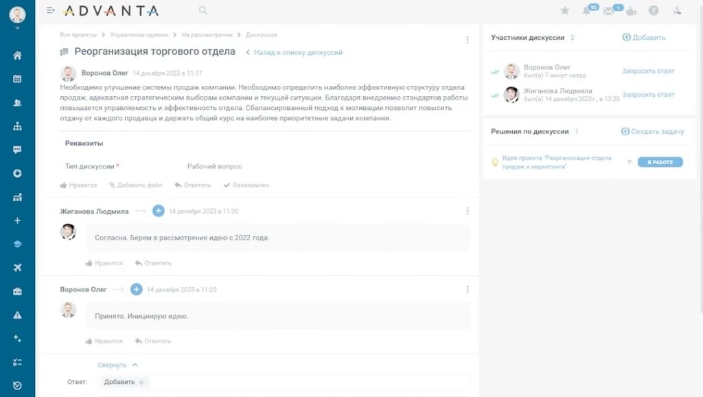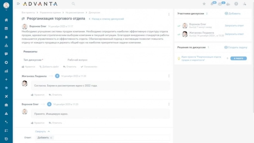 Обсуждение идей внутри единой системы управления инвестпроектами ADVANTA